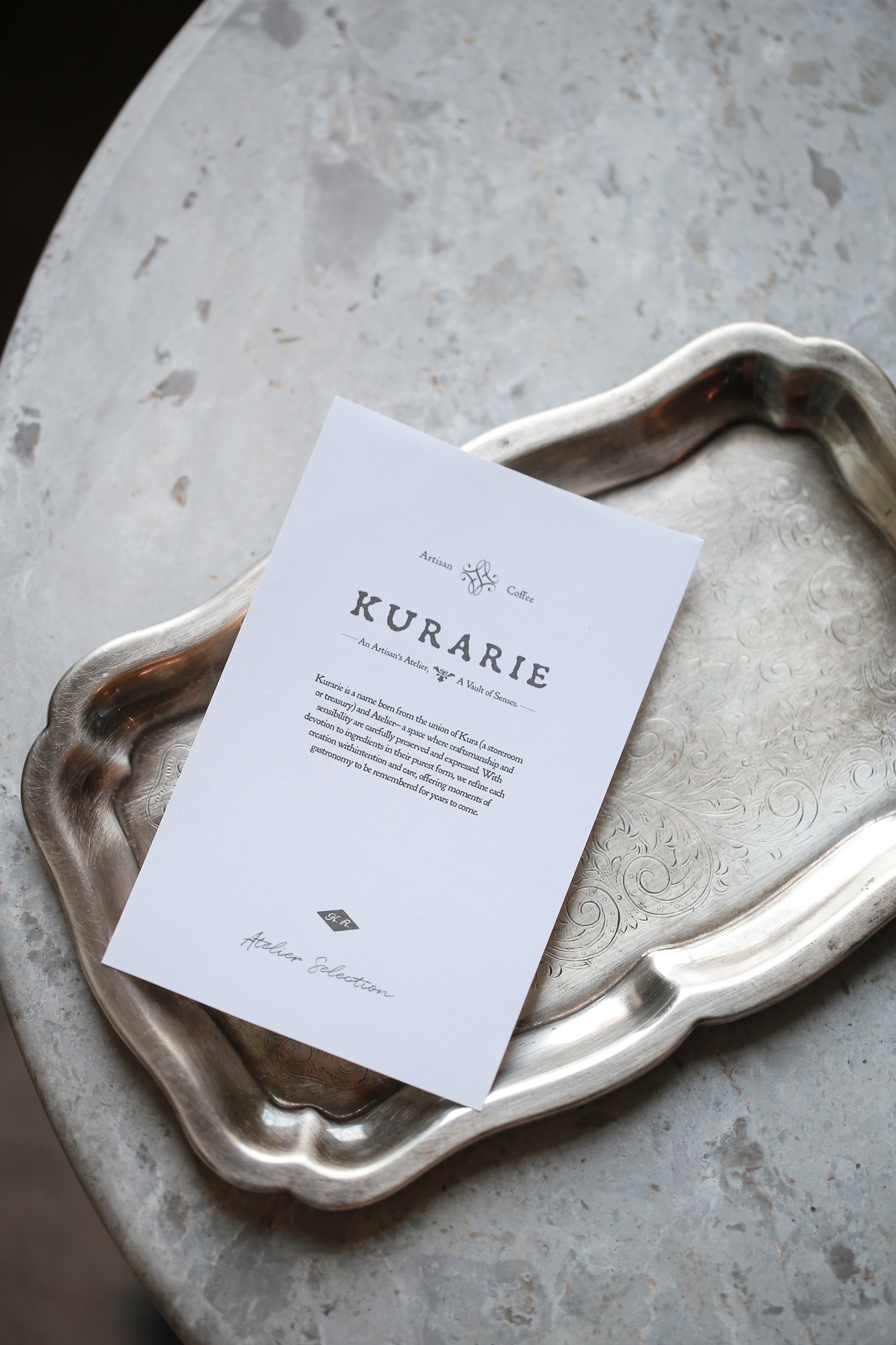 쿠라리에는 KURA(蔵, 금고∙창고)와 Atelier(작업실)을 결합한 이름으로, 장인의 예술성과 섬세함으로 원석 같은 재료를 작품처럼 다듬어 고객에게 오래 기억될 특별한 순간을 선사하겠다는 뜻을 담았다.